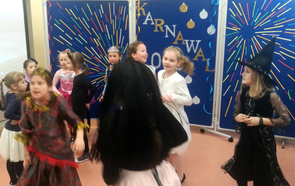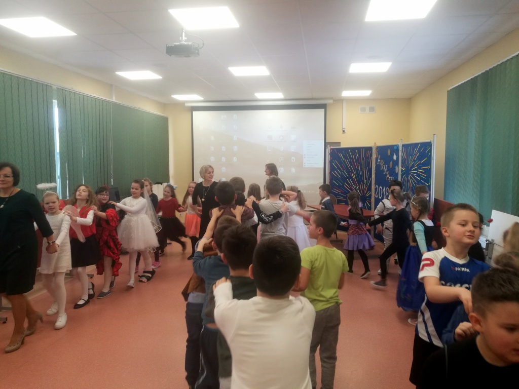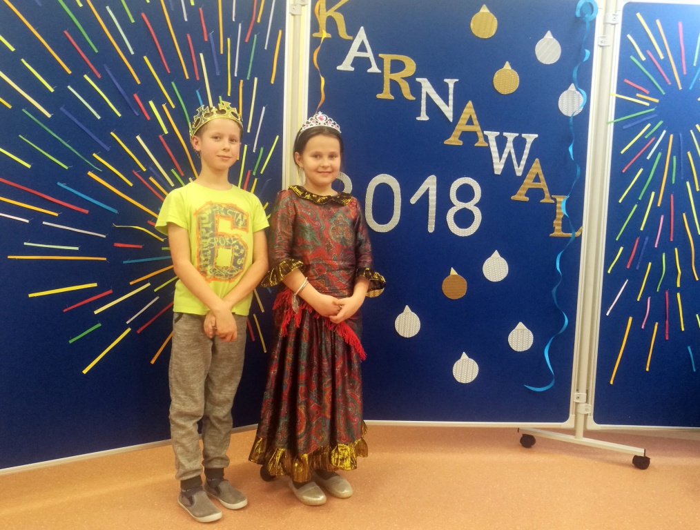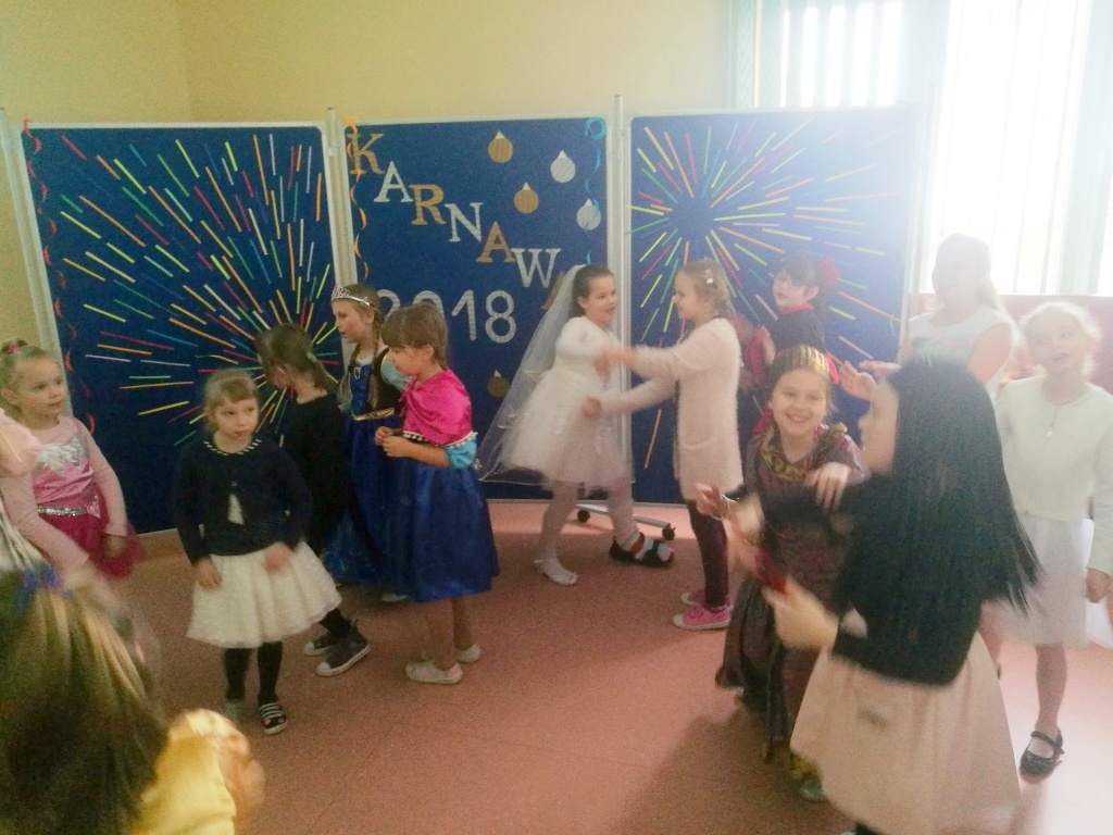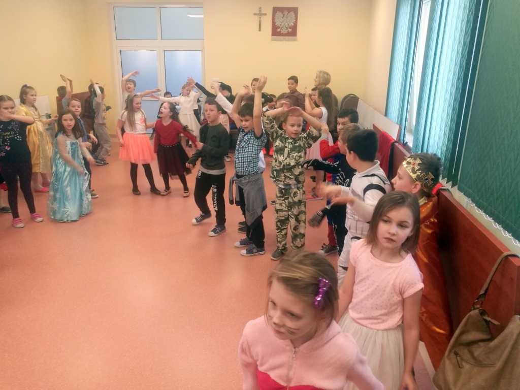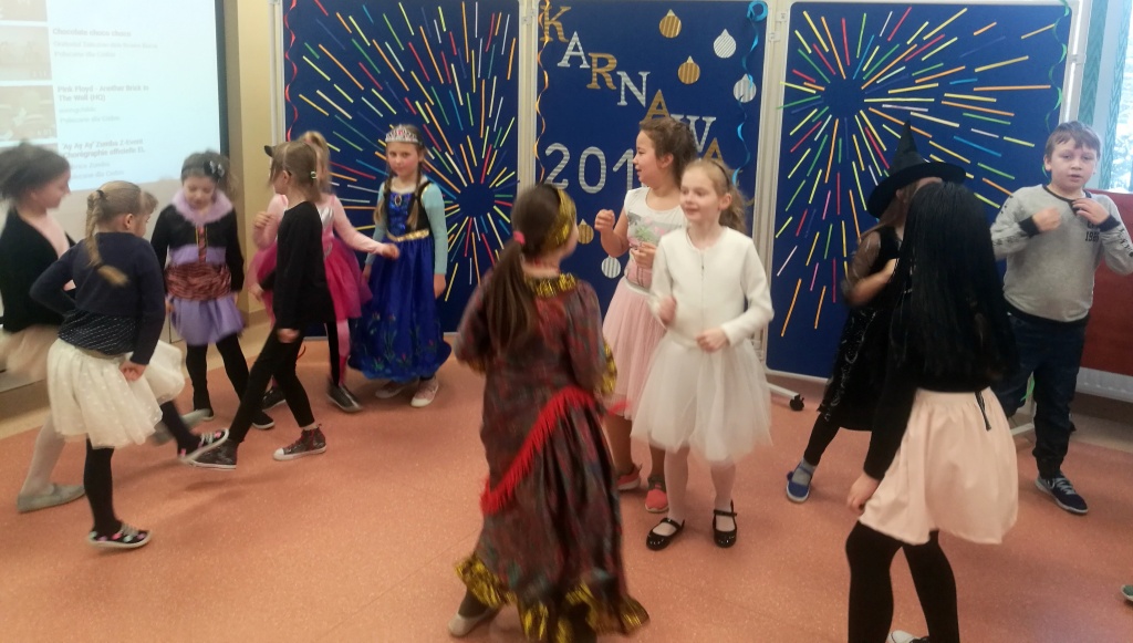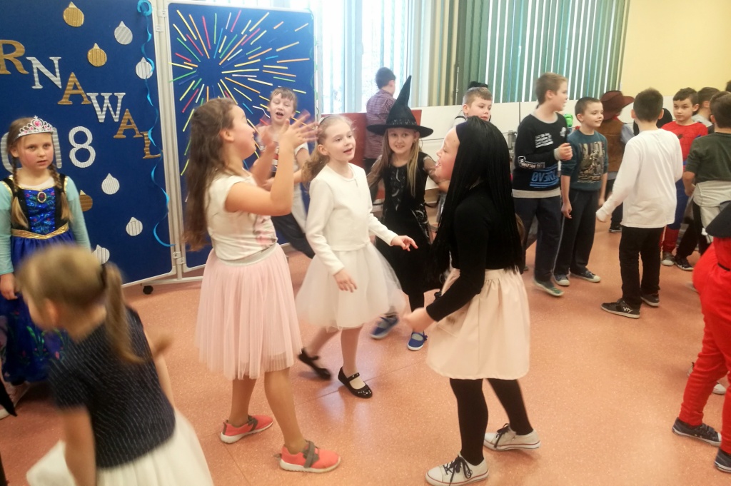 W dniu 18 stycznia dzieci z klas początkowych miały zabawę karnawałową. Chłopcy i dziewczynki przebrali się z tej okazji za bohaterów swoich ulubionych filmów, gier i książek. Na korytarzach można było spotkać wróżki, księżniczki, piratów, kowboi, aniołki, rycerzy, a nawet pannę młodą – nie sposób wyliczyć wszystkich barwnych i wesołych postaci. Na sali podczas pląsów robiło się kolorowo, wszyscy bawili się wesoło, uśmiech nie znikał z twarzy mimo chwilowego zmęczenia. Niektóre tańce były prowadzone przez dziewczynki z grupy tanecznej „Rytm”, ale większość tanecznych rytmów dzieci same wybierały, kierując się najnowszymi trendami w muzyce rozrywkowej. Dodatkową atrakcją był słodki poczęstunek, przygotowany w salach według pomysłów i inwencji dzieci oraz projekcja bajek. Na zakończenie balu wybrano królową i króla balu, którymi zostali Amelka Kostrzewska i Kacper Romanowicz.