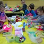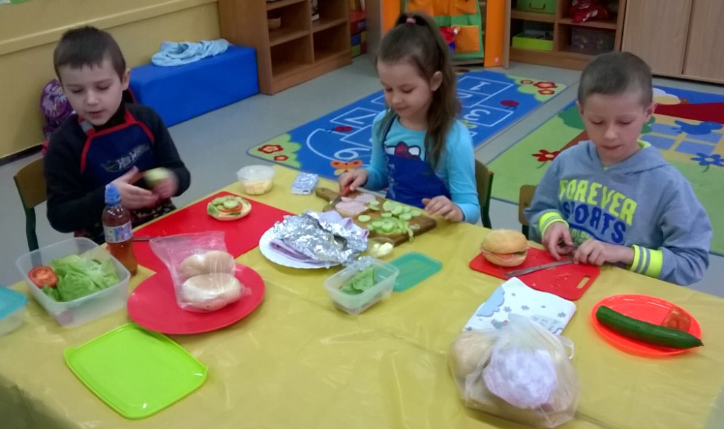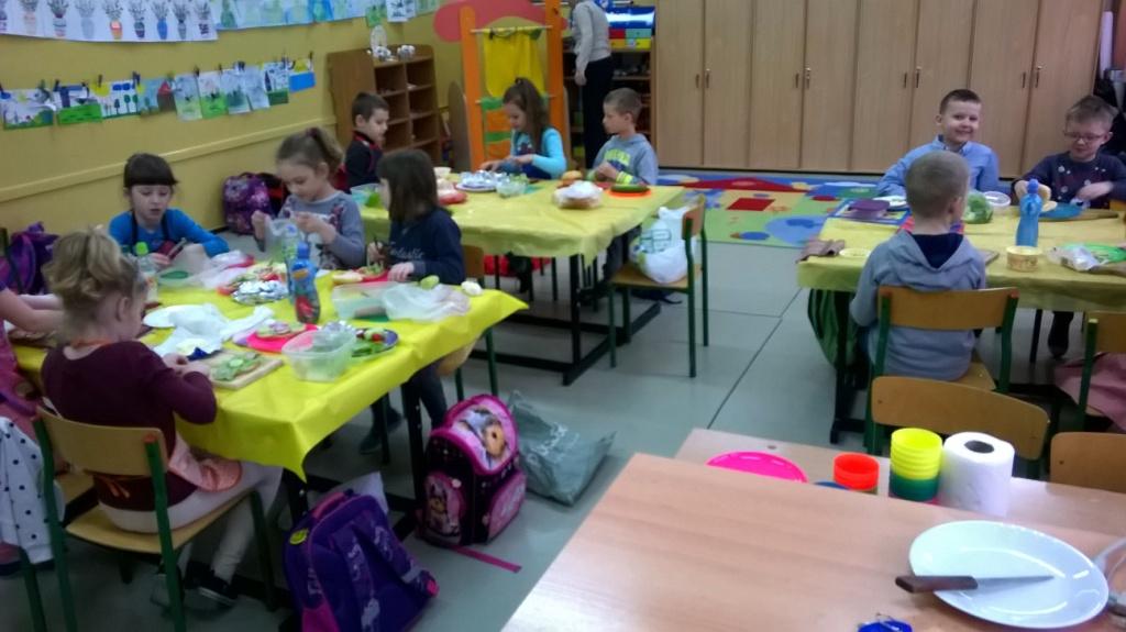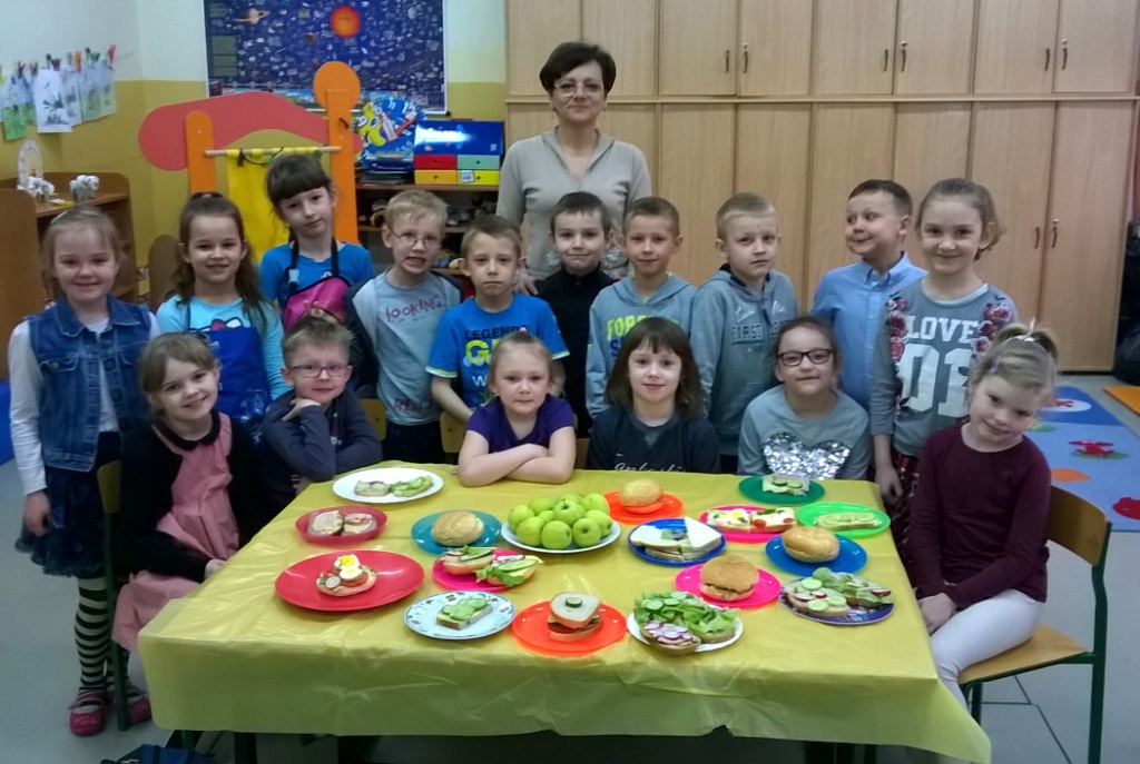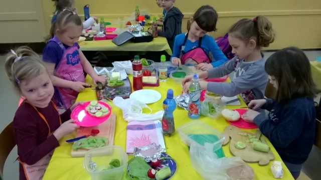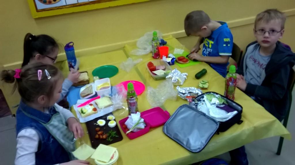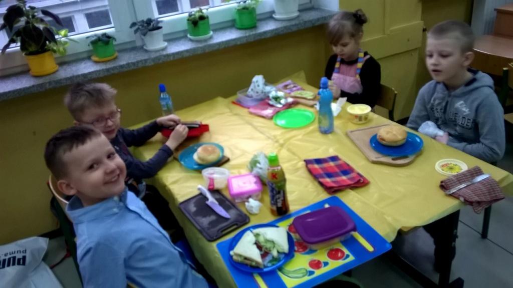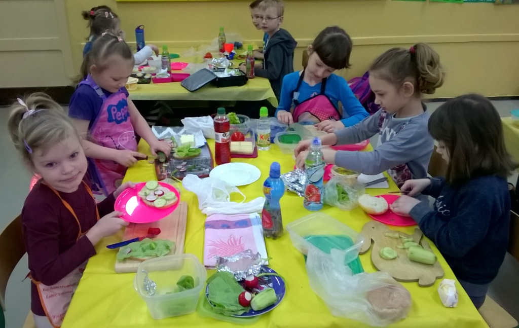 W dniu dzisiejszym dzieci z klasy I a samodzielne przygotowały pyszne i zdrowe drugie śniadanie. Przed przystąpieniem do działań kulinarnych pierwszaki umyły ręce i przygotowały stanowiska pracy. Następnie wszyscy wspólnie przypomnieli sobie zasady bezpieczeństwa, których należy przestrzegać podczas posługiwania się kuchennymi przyborami, zwłaszcza nożem. Można śmiało powiedzieć, że uczniowie zadanie wykonali doskonale: kanapki były nie tylko smaczne, zdrowe, ale i pięknie ozdobione. Nawet największe niejadki zjadały swoją porcję z apetytem, bo jedzenie lepiej smakuje, gdy się je samodzielnie przygotuje, ładnie poda i wspólnie spożywa. To była wspaniałą lekcja samodzielności, gotowania i wyrabiania zdrowych nawyków żywieniowych.